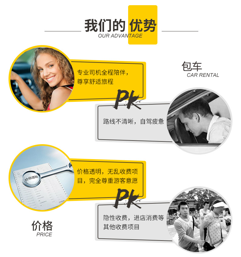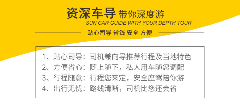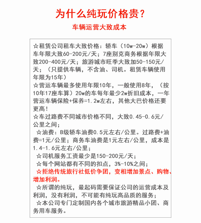 线路特色: 一:纯玩无购物:拒绝传统低价团,所有消费明码标价,绝无隐形加点购物 二:高端车型:拒绝传统旅游大巴,空调不好的面包车,只提供高端商务车 三:景点游览时间充足,拒绝传统式走马观花式旅游您的行程你做主