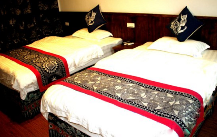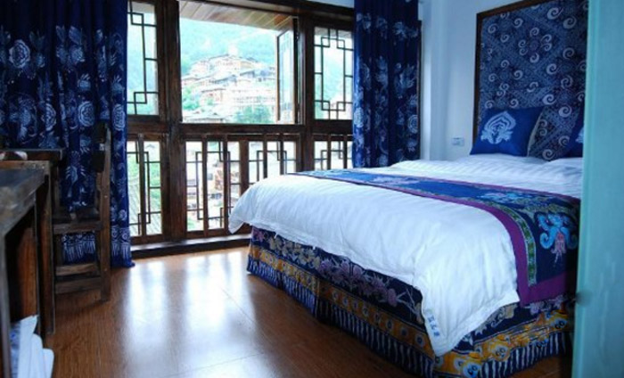 西江蓝花主题酒店位于贵州雷山县西江千户苗寨景区,是一家以当地少数民族工艺蜡染为主题的酒店,酒店地理位置醒目,在进小北门左手第一家,方便寻找,飞檐斗拱的亭子,古味十足,依青山而建,上有木质横匾上书“蓝花寨”。蓝花寨大厅是木质结构,游客可以坐在美人靠上喝茶,聊天,看风景!蓝花寨酒店上下五层,三十多个房间,标准间和豪华间都有。无论是客房还是走廊装饰格调突出蜡染的风格,素雅、优美、朴实大方、清新悦目,富有民族特色。客房干净卫生,每个房间空调、热水器、电视、独立卫生间配置齐全,完善的设施和热情的服务,让游客有家一般的温暖与舒适、身心释然流连忘返。