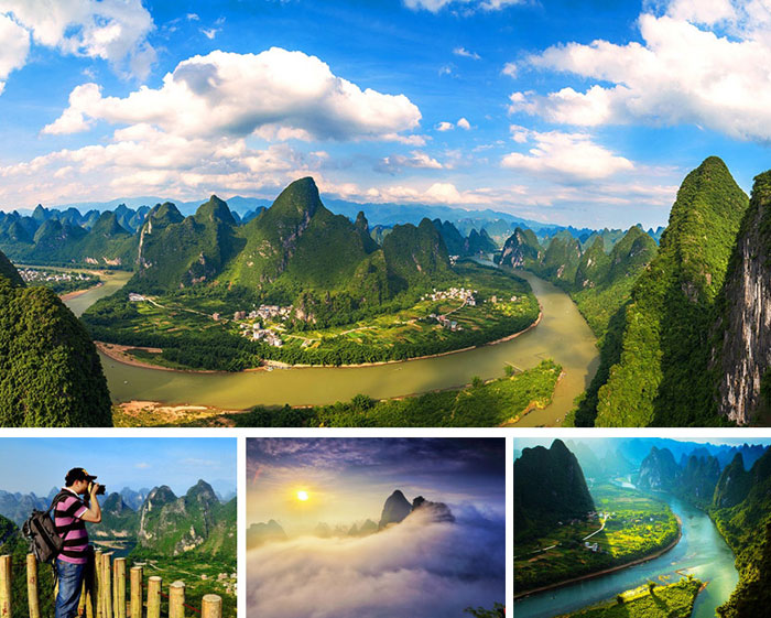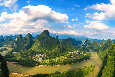 登上相公山举目远眺,群峰排列有序,清澈的漓江蜿蜒流淌在群山怀抱中。
