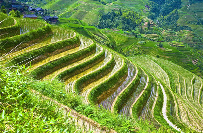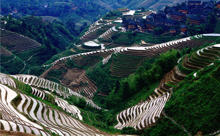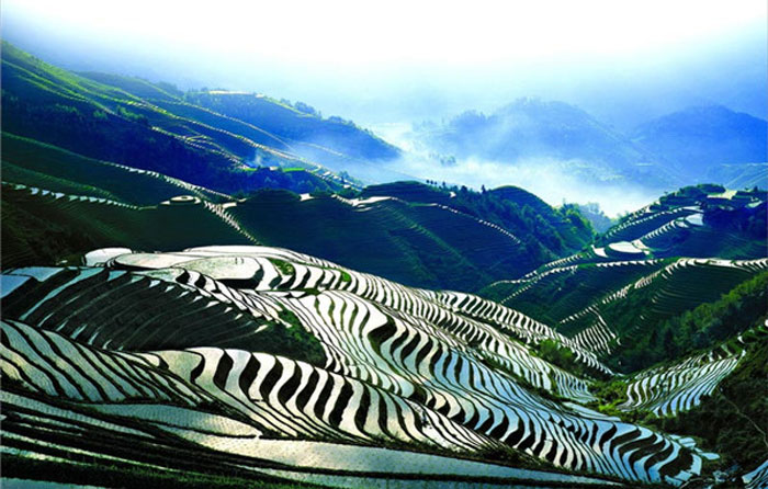 龙脊梯田从山脚盘绕到山顶,小山如螺,大山似塔,层层叠叠,高低错落。从高处望去,梯田的优美曲线一条条、一根根、或平行或交叉,蜿蜒如春螺、披岚似云塔,显示了动人心魄的曲线美。其线条行云流水,潇洒柔畅;其规模磅礴壮观,气势恢弘。