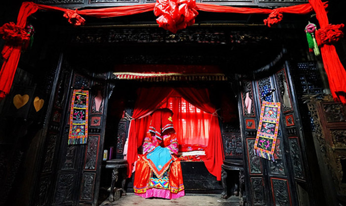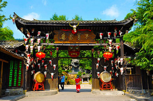 进门之后一只猛虎横卧于前,一个孩子和一只巨猿坐在旁边,这是土家族的图腾,他们自古流传信奉“以虎为父,以猿为母”。寨子里面展示的是一些土家族的繁衍历史、生活习性、使用物品等等,像土家族男女使用的不同的防身武器,有些奇形怪状的。