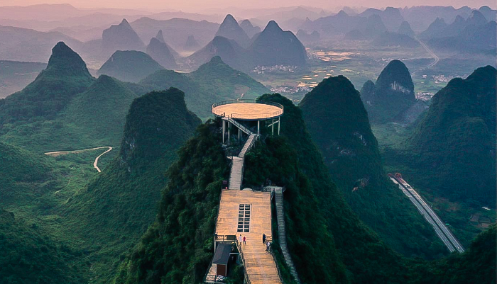 阳朔首个山顶自然公园,由天然的喀斯特自然景观“三峰两谷”(元宝峰、如意峰、项链峰、彩溪谷、百花谷)以及索道、如意云顶观景平台、如意索桥、林中漫步道、玻璃栈道、数字体验馆等创意景观共同组成,游客可高空全方位俯瞰阳朔独特的喀斯特峰林地貌,穿越林间,观赏桂林山水风光,也可体验漫步林间的乐趣!