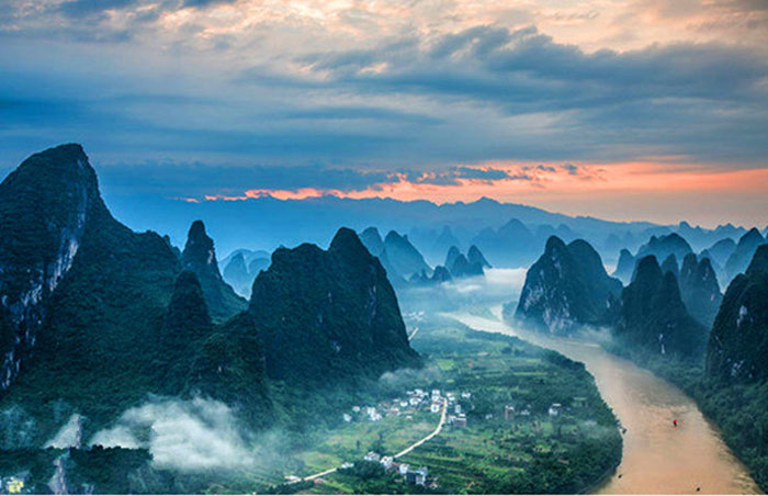漓江,是中国锦绣河山的一颗明珠,是桂林风光的精髓。漓江发源于桂林东北兴安县的猫儿山,流经桂林、阳朔,至平乐县恭城河口,全长437公里。由桂林至阳朔84公里的漓江,大致可分为三个景区:桂林市区至黄牛峡;黄牛峡至水落村;水落村至阳朔;正如宋代著名文学家韩愈的诗句所言:“江作青罗带,山如碧玉簪”,三个景区的这一段水路被誉为漓江百里画廊。