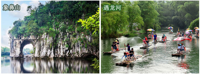 游览桂林城徽【象鼻山】(游览时间约60分钟),它坐落在桂林市中心的漓江与桃花江汇流处,形似一头鼻子伸进漓江饮水的巨象,象鼻和象腿之间是面积约一百五十平米的圆洞,江水穿洞而过,如明月浮水。坐落西岸的象山水月与漓江东岸的穿月岩相对,一挂于天,一浮于水,形成“漓江双月”的奇特景观。凡是来桂林旅游的国内外游客,必游象鼻山。