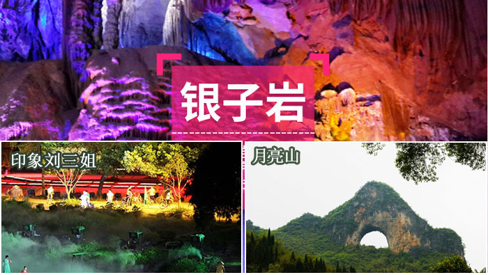参观【银子岩】(游览时间约60分钟),银子岩溶洞是典型的喀斯特地貌,贯穿十二座山峰,属层楼式溶洞,洞内汇集了不同地质年代发育生长的钟乳石,有桂林最美岩洞之称,洞内汇集了高达数十米,雄、奇、幽、美,像银子似钻石的钟乳石。洞内奇特的自然景观堪称鬼斧神工,色彩缤纷而且形象各异的钟乳石石柱、石塔、石幔、石瀑,构成了世界岩溶艺术万般奇景,令人流连忘返,美国前总统克林顿也是它的粉丝, 98年访华时为了游览银子岩专门推迟了去香港的班机!十里画廊“赏月路”而行欣赏—【月亮山】(游览时间约20分钟)月洞与它后面的峰峦重叠程度不同,出现顷刻之间可以观赏到满月、半月和新月的奇观,这是阳朔风光的一绝。
