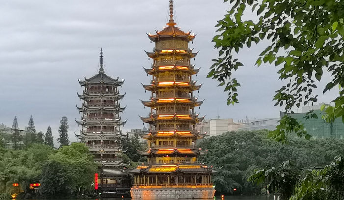 17:00 前往新桂林的标志【日月双塔】,双塔在杉湖岛上,与象山相邻。漫步在此,远远地外观日月双塔,和它拍一张亲密合照。一定会刷爆你的朋友圈,为您此次桂林之行划上圆满句号。日月双塔是坐落于桂林市中心杉湖中的两座宝塔,日塔为铜塔,月塔为琉璃塔,两塔之间以湖底一条10多米长的湖底隧道相连。每到夜晚,两座塔在灯光映衬下分别散发着金银两色光芒,倒影在湖中的景象格外漂亮。